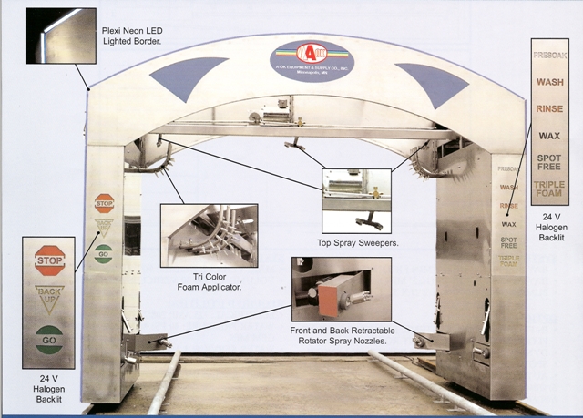 High Pressure Automatic Touch Free car wash system with stainless steel rollover gantry automatically sizes each vehicle to assure consistent quality with every wash. All electric direct drive system with operator adjustable speed control and programmable computer provides versatility and control at your finger tips.